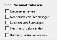 Sie können für alle Mitarbeiter folgende Bereiche sperren oder erlauben: - Umsätze einsehen - Nachdruck von Rechnungen - Löschen von Buchungen - Rechnungsdatum ändern - Buchungszeiträume ändern | |